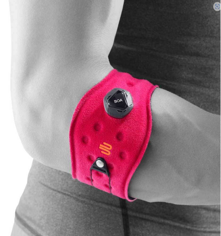 De pelotte wordt zo vastgeklit dat hij aan de buiten- of binnenkant van de elleboog komt te liggen. De vijf noppen oefenen druk uit op de pijntriggerpunten en stimuleren daardoor het gebied. Irritaties en ontstekingen kunnen sneller afnemen. De Sports Elbow Strap is bijzonder plat, anatomisch gevormd en is gemaakt van ademend, slijtvast materiaal. Daardoor is de brace aangenaam om te dragen en praktisch tijdens het sporten. De brace wordt met behulp van een Boa®-sluiting vastgetrokken totdat ze veilig vast zit, zonder in te snoeren en totdat de gewenste druk is bereikt. De brace kan elk moment iets losser of strakker worden ingesteld en snel worden verwijderd.