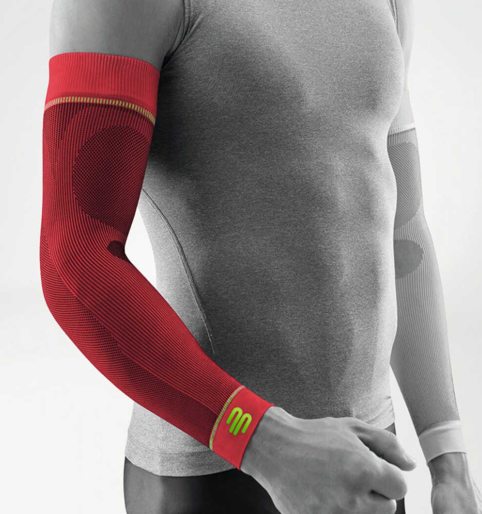 De comprimerende werking vindt plaats volgens de medische richtlijnen, d.w.z. de druk neemt af van de pols naar de bovenarm. Dat stimuleert de doorbloeding en voorkomt dat je snel moe wordt. De spieren worden beter van zuurstof voorzien, blijven beter presteren en regenereren sneller. Bovendien worden de armspieren snel opgewarmd door de gestimuleerde bloedcirculatie en zijn daardoor beter beschermd tegen blessures. De sleeves in sportief design zijn verkrijgbaar per paar, slijtvast, ademend en voor meer draagcomfort extra zacht aan de binnenkant van de elleboog. Ze kunnen gewassen worden op 40 °C. Voor de keuze van de juiste maat moet de omvang van de pols, de omvang van de bovenarm ter hoogte van de oksel en de armlengte van de pols tot de oksel worden opgemeten.