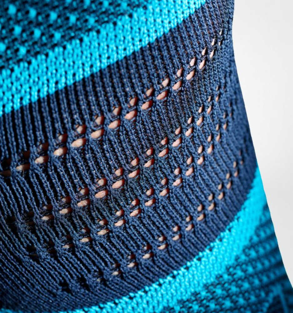 Op deze manier worden belasting en risico's op blessures effectief tegengegaan. Pijn door overbelasting neemt sneller af waardoor schadelijke pijnontwijkende houdingen worden vermeden. Het breiwerk van de Sports Knee Support lijkt op een fijn netwerk van luchtige mazen en bestaat uit ademend, slijtvast materiaal. Daardoor is de bandage bijzonder licht, aangenaam om te dragen en praktisch tijdens het sporten. De anatomische pasvorm en de contactzones zorgen ervoor dat de bandage goed blijft zitten bij een maximale bewegingsvrijheid.